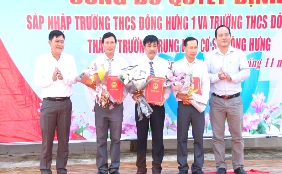 Cũng tại buổi lễ lãnh đạo UBND huyện đã trao quyết định sáp nhập trường, quyết định bổ nhiệm hiệu trưởng, phó hiệu trưởng cho các cá nhân. Theo đó, ông Châu Quang Phồ được bổ nhiệm giữ chức Hiệu trưởng trường THCS Đông Hưng; các ông Lê Công Tuấn, Lê Văn Nghiệm lần lượt giữ chức vụ Hiệu trưởng trường Tiểu học Đông Thạnh 1 và Đông Thạnh 2.