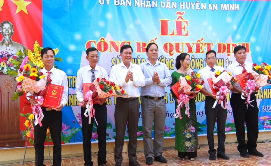 Các đồng chí lãnh đạo HĐND- UBND huyện An Minh trao quyết định bổ nhiệm Ban giám hiệu trường Tiểu học Đông Thạnh 1 và Tiểu học Đông Thạnh 2