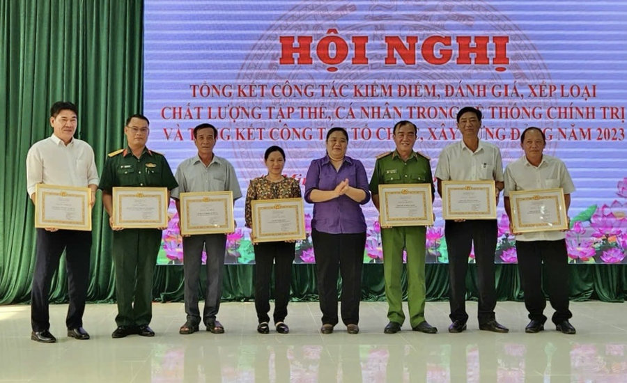 Đồng chí Bùi Thị Hiền, Tỉnh ủy viên, Bí thư Huyện ủy An Minh, tặng giấy khen cho các chi, đảng bộ hoàn thành xuất sắc nhiệm vụ năm 2023.