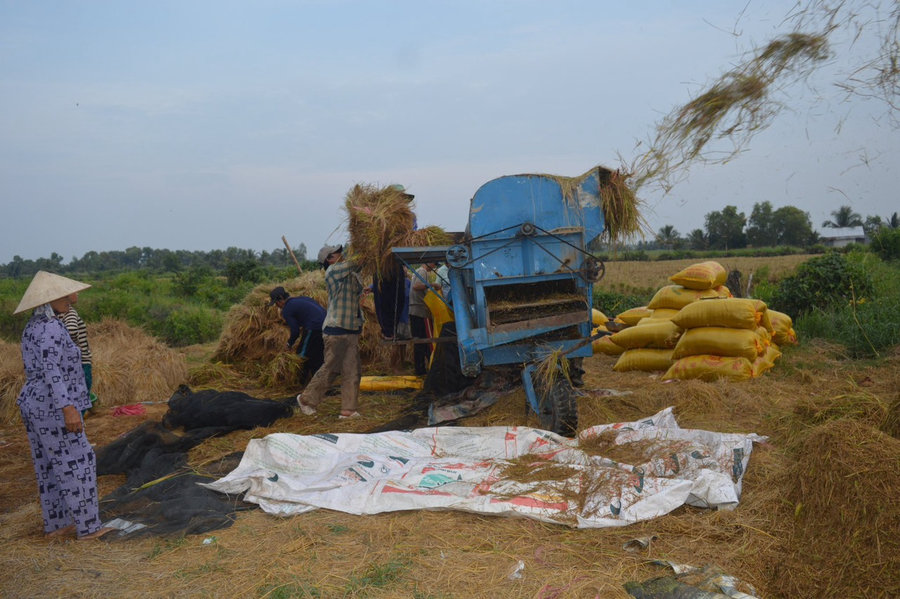 Nông dân xã Đông Thạnh, huyện An Minh, thu hoạch lúa.