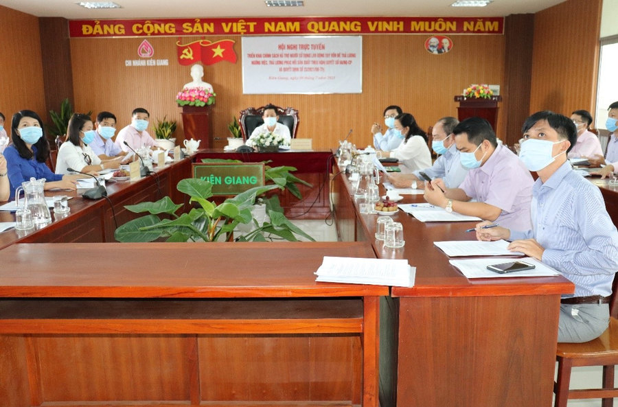 chủ trì tại Điểm cầu Chi nhánh Ngân hàng Chính sách xã hội tỉnh Kiên Giang tại hội nghị trực tuyến toàn quốc triển khai cho vay ngừng việc theo Nghị quyết 68/NQ-CP)
