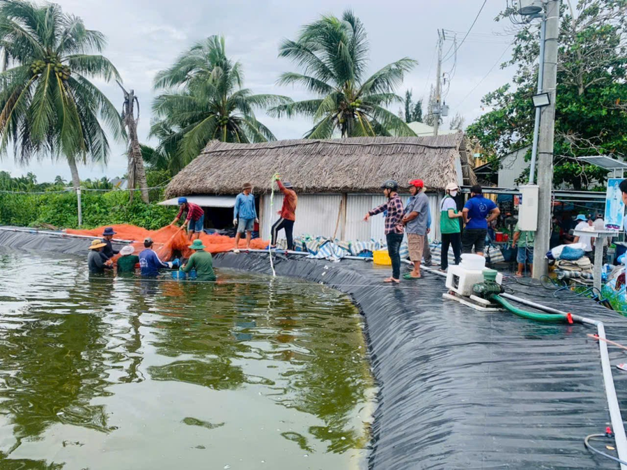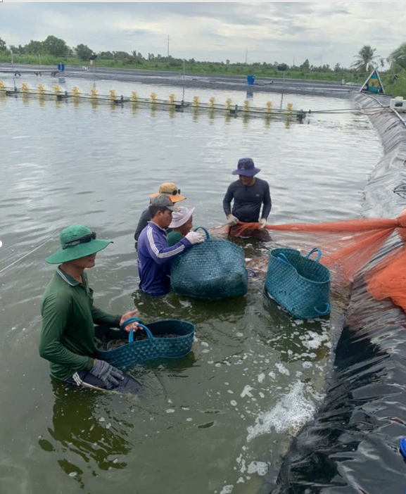 Quang cảnh thu hoạch vụ tôm đầu tiên của anh LýHồng Trương