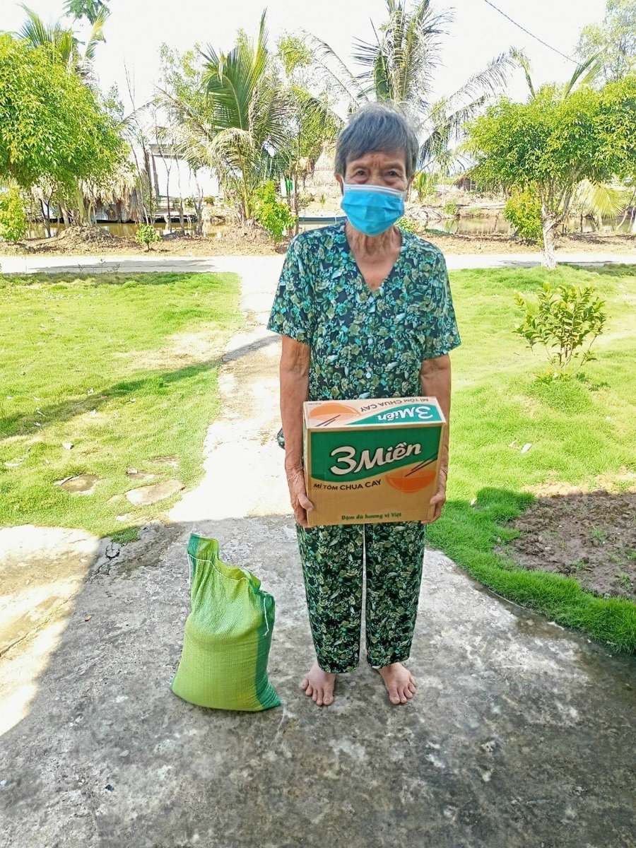 Bà Nguyễn Thị Anh, hộ nghèo ấp Thạnh Phong đại diện gia đình nhận gạo và mì gói do Ủy ban Mặt trận Tổ quốc Việt Nam xã Đông Thạnh tặng trong mùa dịch Covid-19.